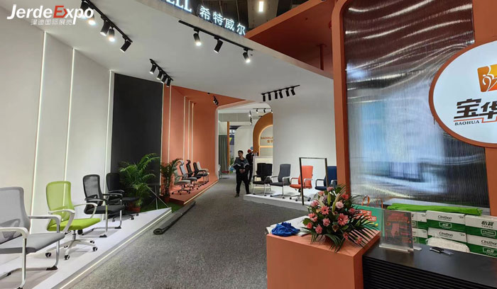 中國廣州家博會第一期展會結束后,第二期廣州家博會在2023年3月28日迅速開展,本次澤迪展覽第二期家博會首次攜手“希特威爾”亮相,“希特威爾”展臺共占地面積為180平方米,展臺主要以白色與橙色相結合,外輪廓以方正形式展現,門頭極具創意的設計風格充分體現了“希特威爾辦公椅”以簡約現代實用為理念的設計風格。展臺使用材料包括:木結構烤漆 內嵌燈條 燈帶 射燈 綠植等。